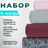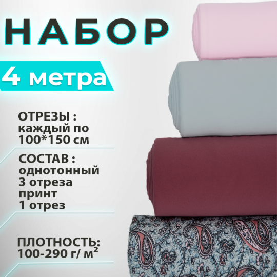 Набор ткани трикотаж масло 4 метра от бренда Ткани Плюс – идеальное решение для любителей шитья и рукоделия. Этот набор предназначен для создания уникальных аксессуаров для дома, изготовления кукол и игрушек. Отлично подходит для пошива одежды для взрослых и детей: футболок, платьев, юбок, брюк, туник, логсливов. Ткань изготовлена из комфортного и долговечного материала, состоящего из 90% полиэстера, 5% вискозы и 5% эластана, что обеспечивает ей отличные свойства: эластичность, мягкость и легкость в обращении. Средняя плотность тканей в наборе составляет 170-200 г на метр в квадрате. Ткань приятна для тела, хорошо драпируется, не мнется, не закатывается и не меняет цвет после стирки. В набор входят как однотонные, так и принтованные ткани, которые отлично сочетаются между собой, что позволяет создавать яркие и стильные изделия. Набор идеально подходит для тех, кто ценит качество и удобство в работе с тканями. Обратите пожалуйста внимание на то, что цвет ткани может незначительно меняться в зависимости от настроек Вашего экрана.
